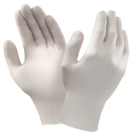 Guanti in lattice monouso da esaminazione non sterili, colore bianco, rivestimento interno in polimeri sintetici, forma anatomica, ambidestro, superficie testurizzata,
